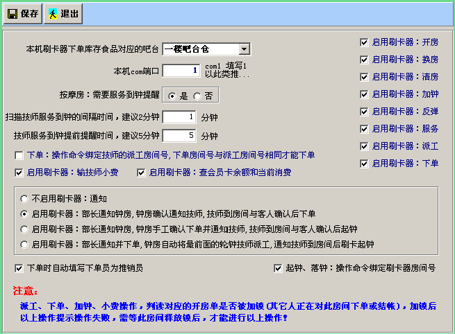 在“技师刷卡上下钟的卡号/考勤卡号”设置技师卡