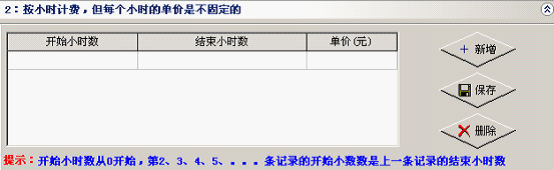 输入“项目编码”、“项目名称”、“单价”(按软件的提示进行设置),选择“计费方式”、 “记帐科目”、“折扣设置”、项目是否需要场地等等。在选择该计费方式后,如上图所示,点击“新增”按钮,输入开始小时数到结束小时数、单价,然后点击“保存”即可。若增加多个不同小时数,点击新增,输入信息然后保存即可。