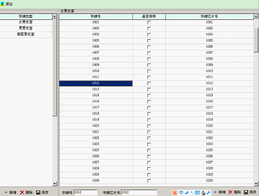 在该窗体中,分为手牌类型和手牌两大部分,选择手牌类型栏,点击“新增”按钮,输入手牌类型名称,点击保存即可。选择手牌类型,在手牌窗体中,点新增,输入手牌编号、手牌芯片号和选择该编号的状态(是否停用),然后点击保存即可。