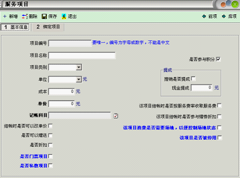 输入“项目编码”、“项目名称”“单价”,选择“计费方式”、“记帐科目”、“折扣设置”、是否需要场地、项目是否被停用等基本信息。